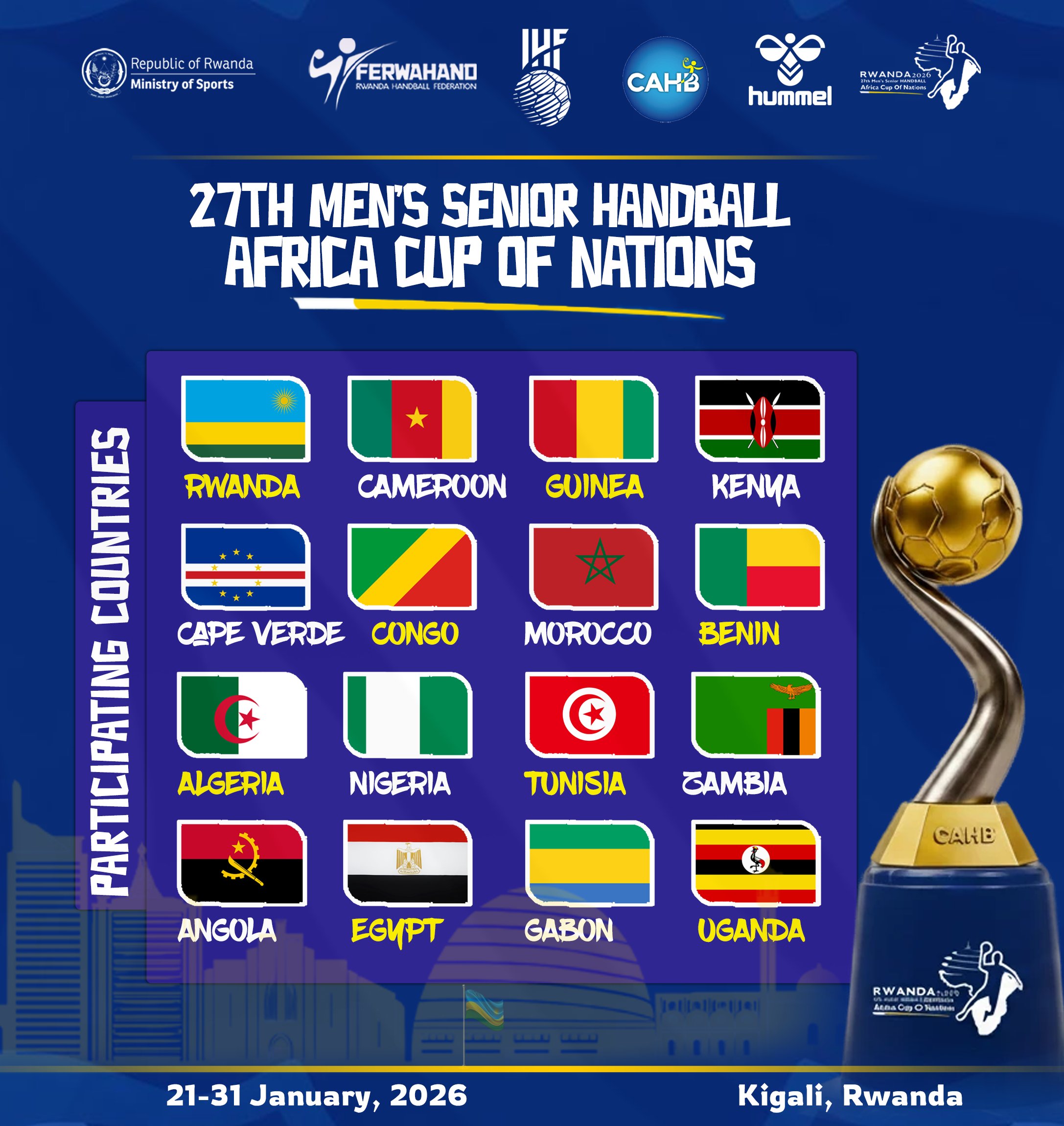 16 Men’s National teams are to compete in the 27th Men’s Senior Handball Africa Cup of Nations scheduled to take place from January 21st to 31st, 2026, with matches to be hosted at BK Arena and Petit Stade Amahoro.